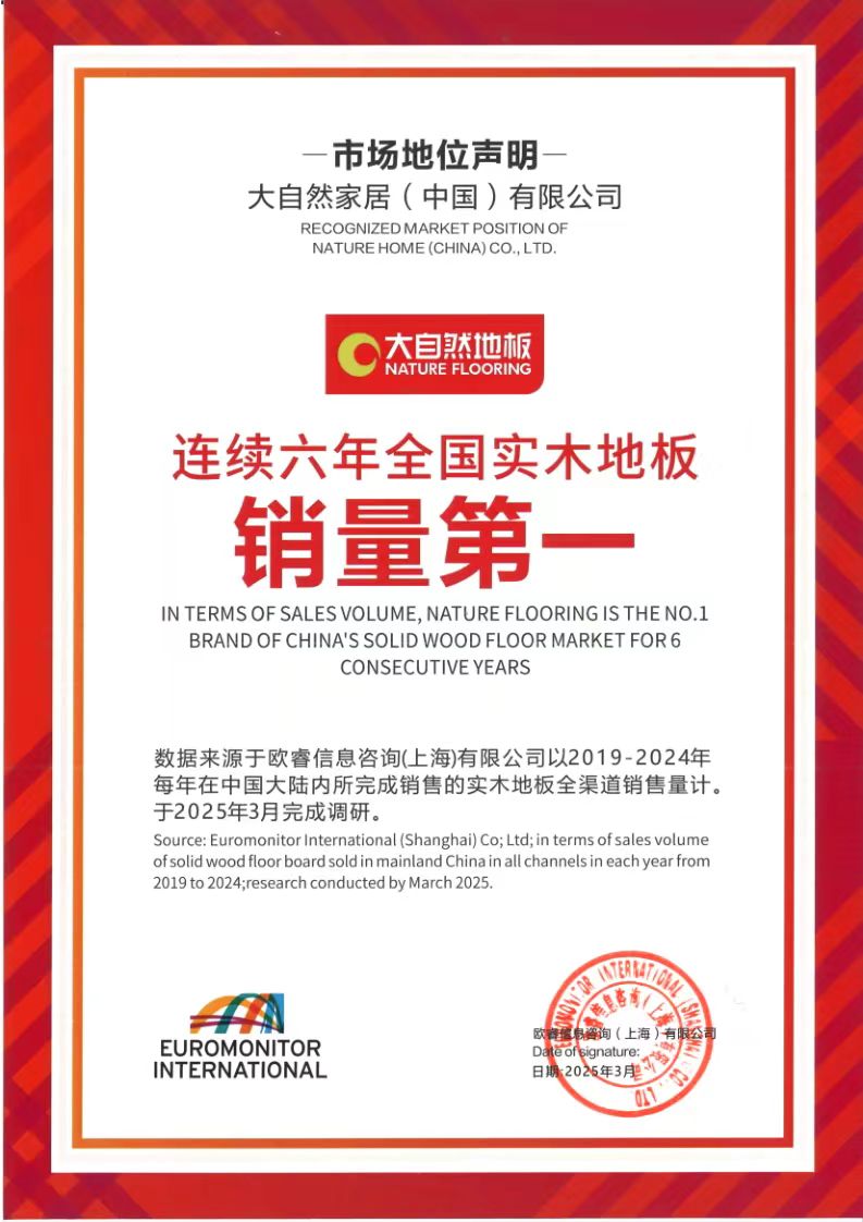 根據(jù)市場(chǎng)權(quán)威數(shù)據(jù)印證了這一戰(zhàn)略成效:歐睿國(guó)際2024年度報(bào)告顯示,大自然實(shí)木地板連續(xù)6年(2019-2024)榮膺“全國(guó)實(shí)木地板銷(xiāo)量第一”和“全球?qū)嵞镜匕邃N(xiāo)量第一”的榮譽(yù),這一成就詮釋了商業(yè)價(jià)值與生態(tài)價(jià)值協(xié)同共生的典范。